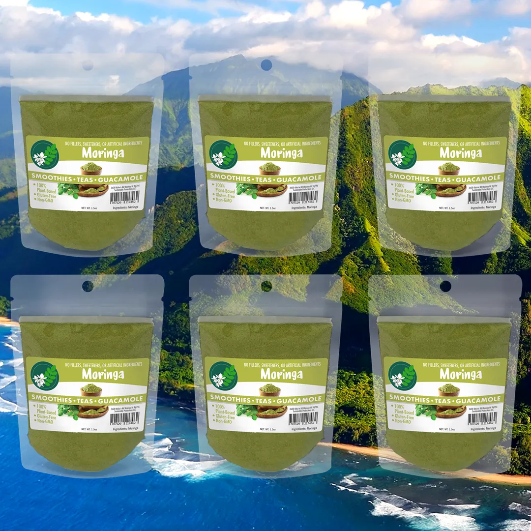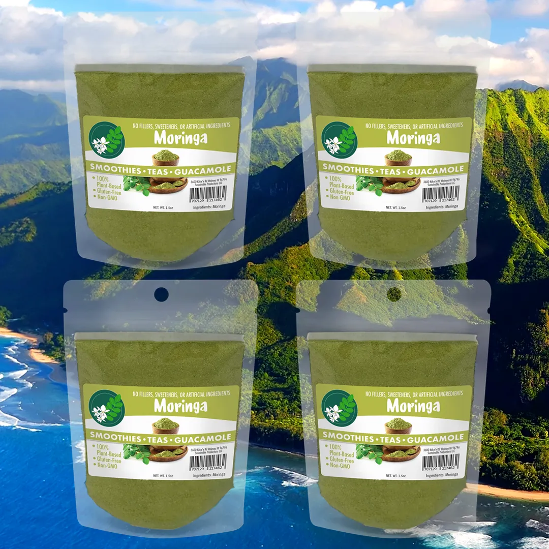 Each 1.5 oz (42.5g) pack of Kaua’i Moringa contains approximately 14 servings, with a serving size of 1/2 teaspoon (2.84g). This provides nearly two weeks of daily use when taken as recommended!